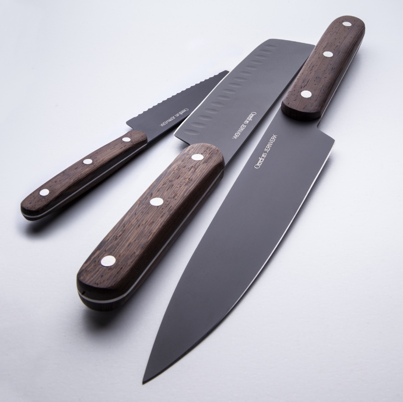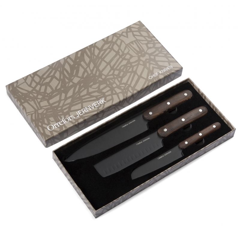 Vackert designat knivset från Orrefors Jernverk. Dessa modeller är ett "måste" i köket. En kockkniv (15 cm), en japansk kockkniv (20 cm) och en tomatkniv (13 cm) av högsta kvalitet. Levereras i en vacker presentförpackning. Den svenska designern Jon Eliason står bakom den moderna designen. Orrefors Jernverk är inte till försäljning i Skandinavien och Finland.